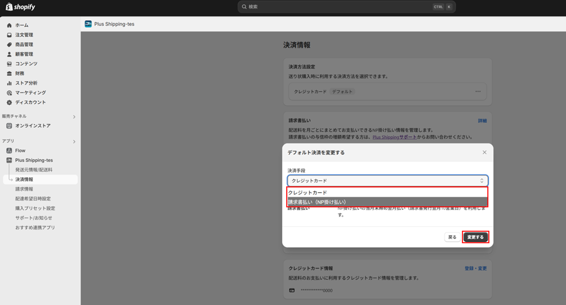 ③決済手段にてプルダウンより、デフォルトの決済手段を選択し「変更する」ボタンを押下