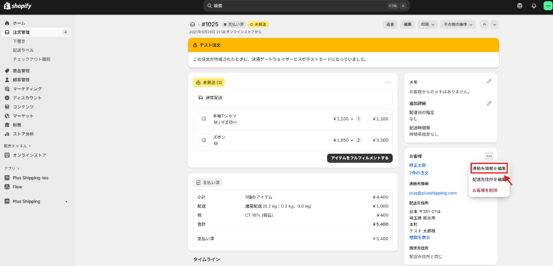 その後、Shopify側の注文情報に遷移しますので、「連絡先情報を編集」よりご修正をお願いいたします。