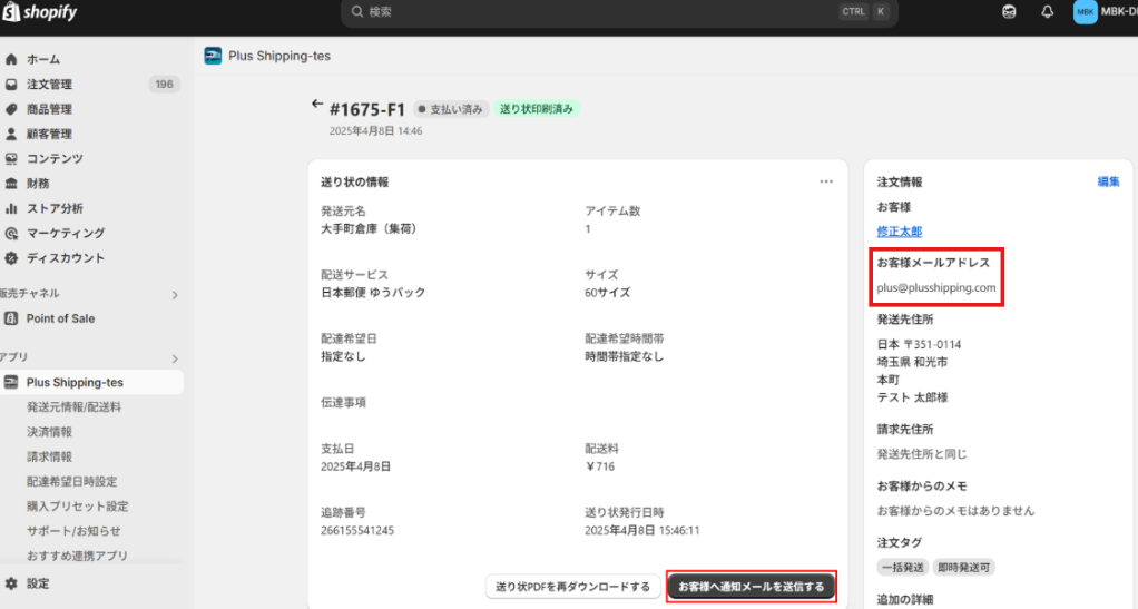 メールアドレスの修正は、Plus Shipping注文管理画面から該当の注文をご選択いただき、上記画像の右上「編集」をクリックしてください。