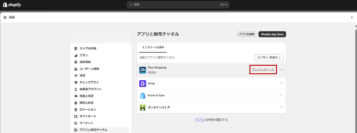 Shopify設定より、アプリと販売チャネルより、アンインストールいただけます。